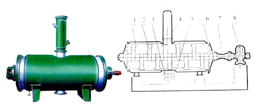 1、殼體 2、耙齒 3、出料裝置 4、加料裝置 5、粉碎棒 6、密封裝置 7、攪拌軸 8、傳動裝置